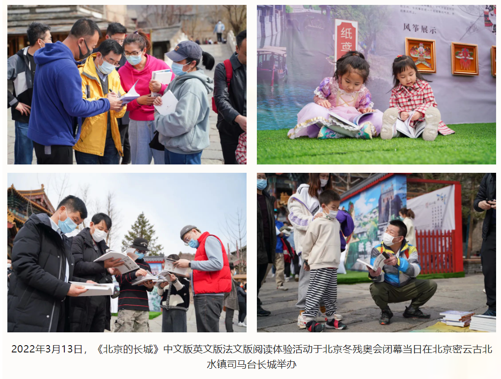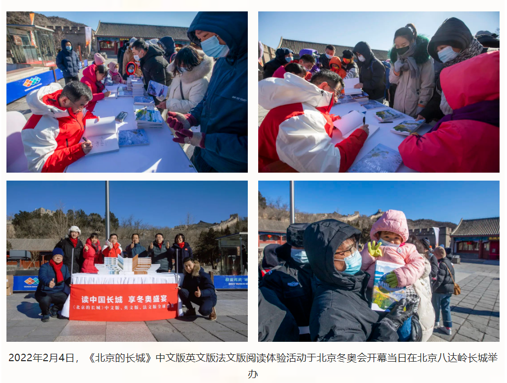 北京2022冬奥期间,《北京的长城》中文版英文版法文版被列入冬奥会外宣赠阅书目,超过10000册中文版英文版法文版已经送达北京奥运村、2022北京新闻中心、北京冬奥会主媒体中心和各赛区媒体接待站,为国际奥委会、各国奥委会及参加北京2022年冬奥会的国际组织、参赛嘉宾、冬奥友人和媒体记者搭建一座中西跨文化交流的桥梁。