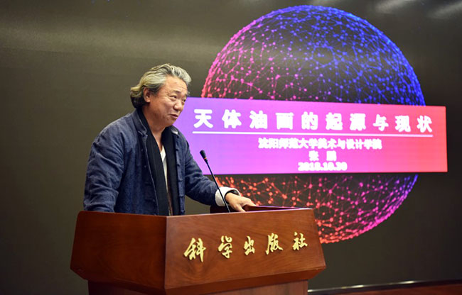 沈阳师范大学美术与设计学院院长张鹏教授在主题报告《天体油画的起源与现状》中讲道:“科学与艺术”在反思和互动中实现创新发展,天体油画涵盖科学透视艺术,艺术也助力科学传播,科学与艺术的融合引发天体油画创作的反思,增进了艺术与科技互动的创新思考。天体油画创作离不开天文学家、物理学家等科学理念的对接和辅助,将天文科学的概念图形化,用意象绘画的方式来表现宇观世界,体现了思想认知和科学观念的综合,天体油画既发展了中国太空美术的艺术形式,更是对中国天文学及艺术与科学实践活动的一个补充。