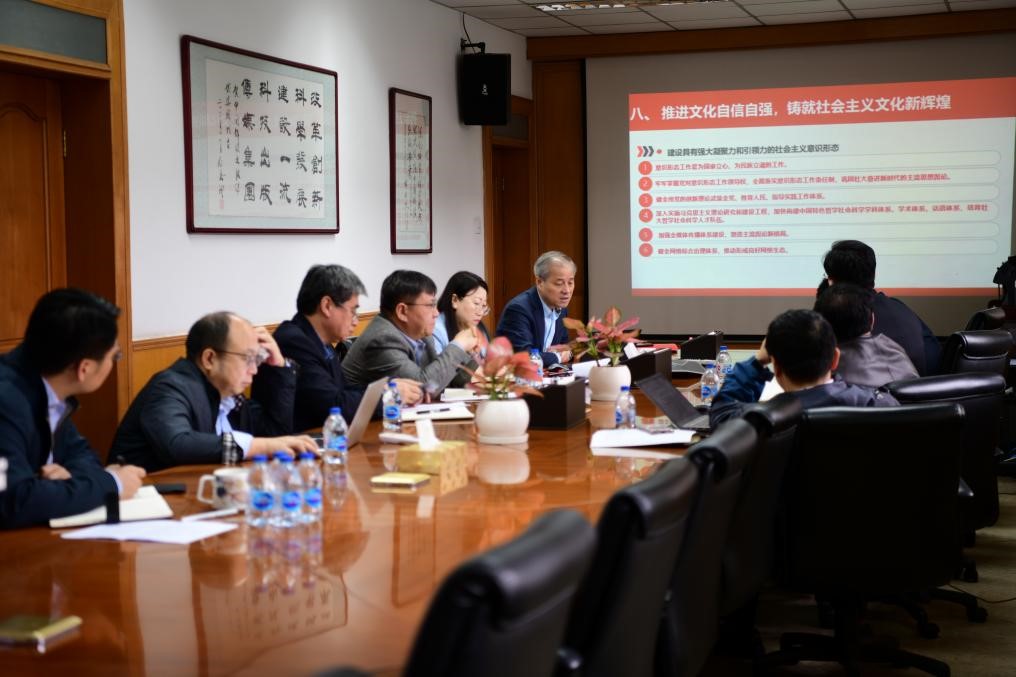 林鹏带领全体与会人员认真学习了二十大报告、习近平总书记在二十届中央政治局第一次集体学习时的重要讲话精神、中科院党的二十大精神传达学习会相关部署要求。与会理论学习中心组成员结合各自分管工作,就深入学习和贯彻落实党的二十大精神做了交流发言。