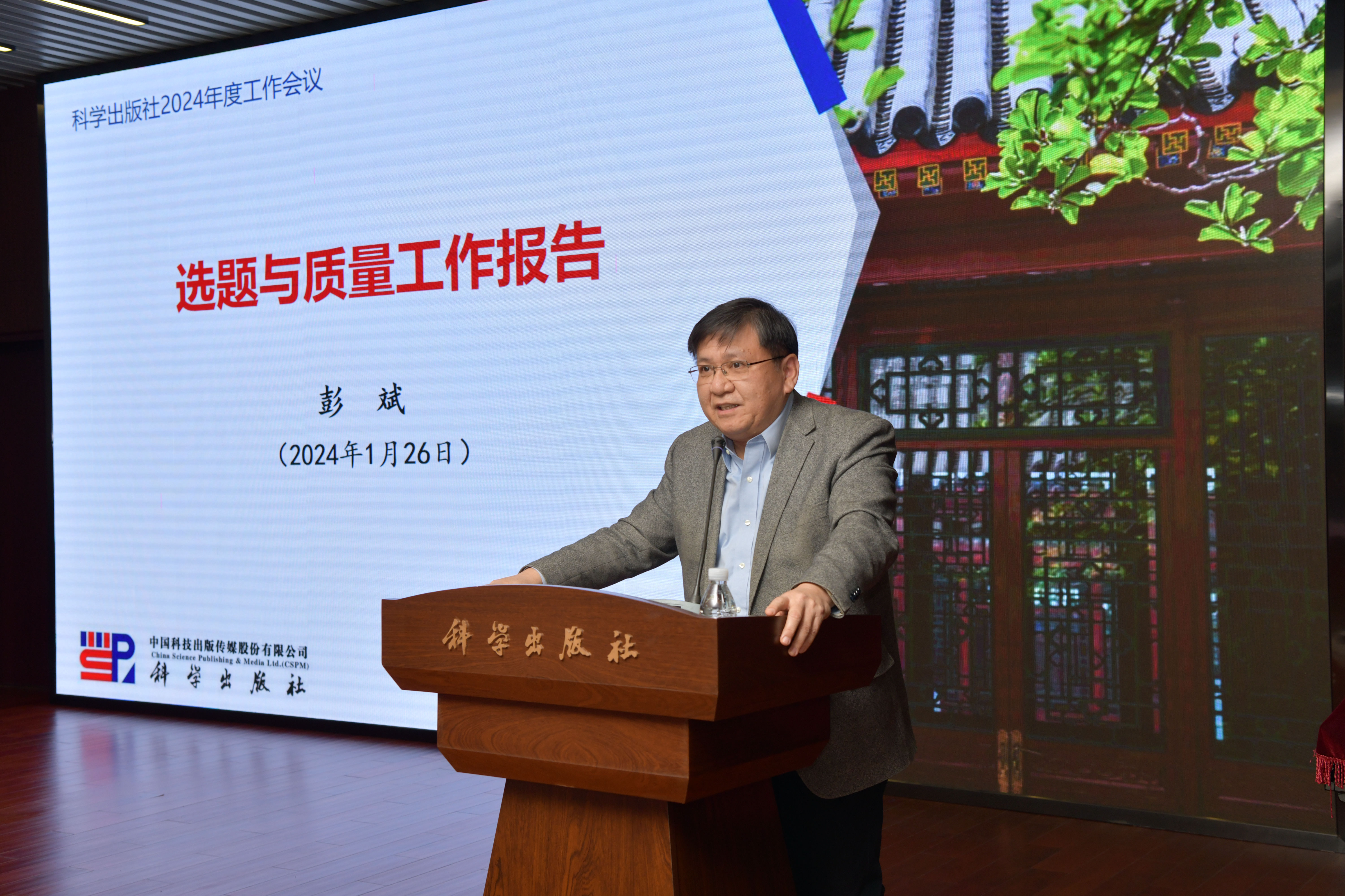 总编辑彭斌作了选题与质量工作报告,围绕选题列选、重大出版项目建设、出版品牌建设、选题管理工作、质量管理工作和编辑队伍建设六个方面,全面回顾了2023年全社图书出版工作情况,分析了当前的出版形势和环境,并从做好选题组织工作、推动选题创新管理、落实意识形态责任制、执行质量保障体系和加快一流期刊建设五个方面部署了2024年的重点工作。